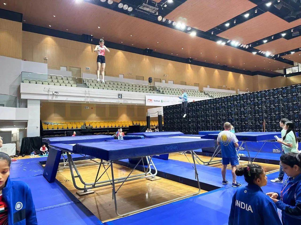 为服务好本届蹦床锦标赛,BB贝博艾弗森官网保障人员严格按照赛事服务手册开展工作,从场馆的规划布局、器材的安装调试、标准高度的校准、过程巡检等各个环节,一丝不苟、严谨细致,确保蹦床器材安装的准确无误,始终践行国际赛场上的中国标准,见证BB贝博艾弗森官网全领域规划、设计、制造、集成、运营、服务一站式解决方案的发展理念。